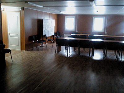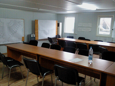 Конференц-зал вмещает до 50 человек, удобен для проведения планерок с мастерами и бригадирами. Высота потолков в конференц-зале - 3 метра. Внутренняя отделка: стены - ламинированная ДСП, потолки - панели ПВХ. Большие кабинеты (из 2-3 модулей) имеют такую же отделку, но высота потолков предусмотрена - 2.5 метра.