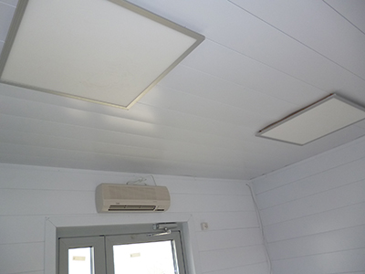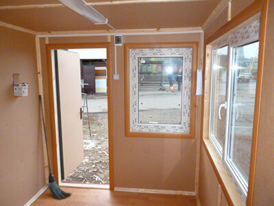 Одномодульные офисы также внутри отделаны панелями ламинированной ДСП (стены), а потолки - пластиковыми панелями белого цвета матового исполнения.