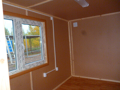 Одно из предприятий в г. Альметьевск Республики Татарстан заказало у нас в компании бытовку для размещения нескольких рабочих мест для ИТР. Пожелание было уложиться в минимальную сумму. Исходя из заданных условий была согласована внутренняя отделка из наиболее дешевого материала - оргалита.