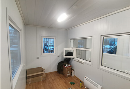 Здание - из сэндвич-панелей с толщиной утепления в 100мм. Габаритные размеры по внешней стороне стен 5.0х6.0м.